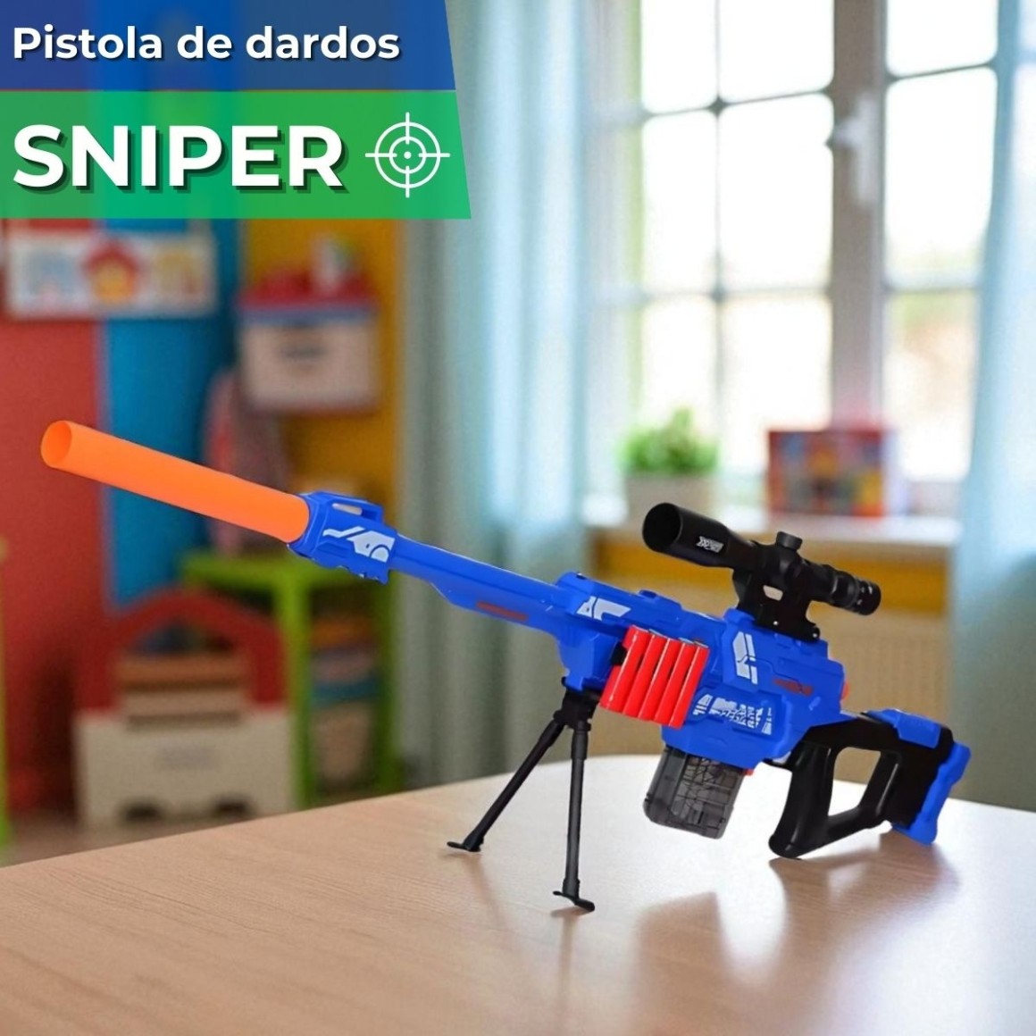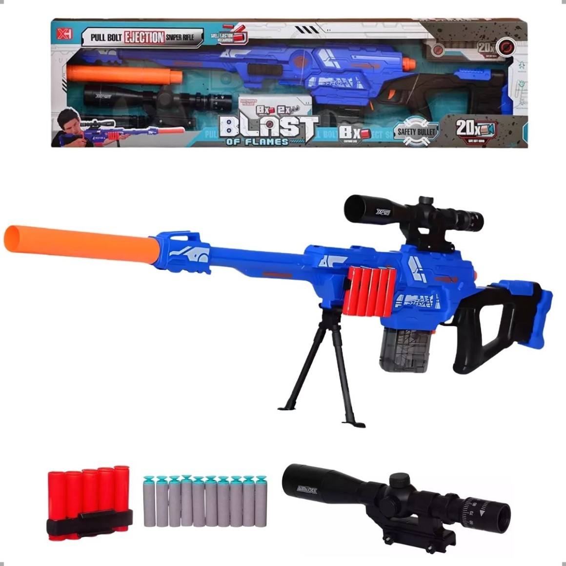 Brinquedo de dardos estilo sniper com mira de luneta, cano silenciador, suporte e 20 dardos. Diversão garantida, design moderno e realista para brincadeiras cheias de ação.