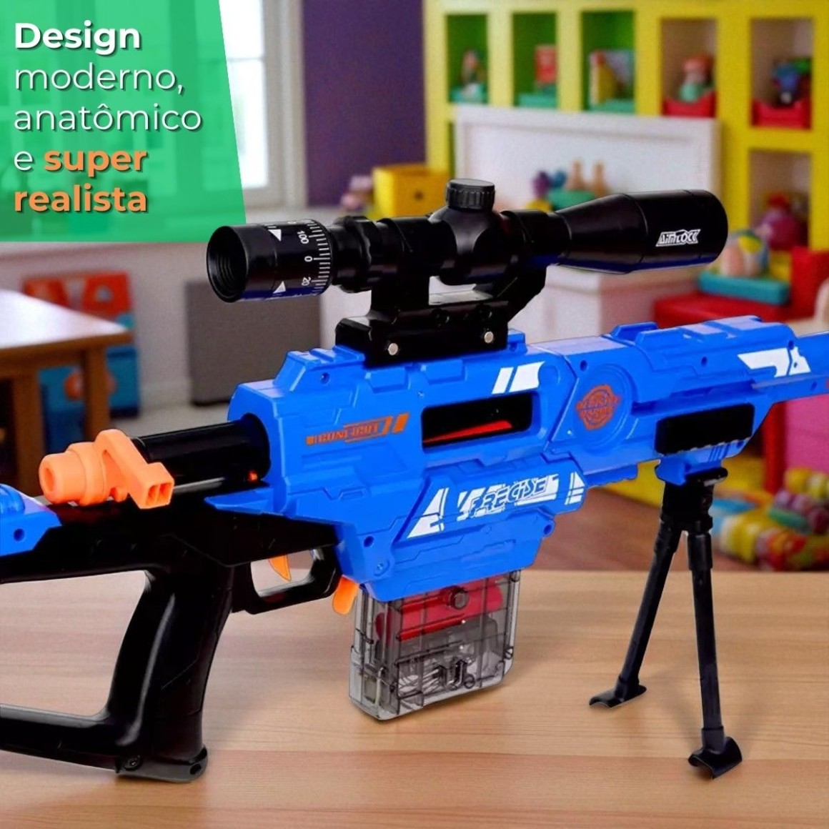 Possui mira com luneta, cano silenciador (alongador) e design moderno para uma experiência mais realista.